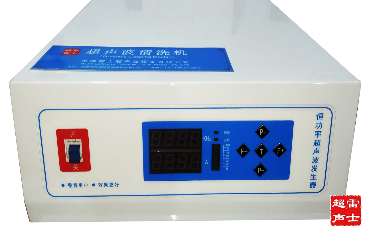 | 经过技术多年研发,雷士超声波发生器产品不断升级,恒功率超声波发生器闪亮登场了, LSAP-FH28雷士恒功率超声波发生器,采用先进的微电脑控制技术及行业领先的电路设计架构,是驱动超声波清洗机,超声波乳化机,超声波萃取机,超声波结晶机的绝佳电源。 一、主面板构成: 1.电源开关:主机电源控制开关。 2.电流显示:显示当前电流值。 3.频率显示:显示当前频率值或当前定时时间,频率单位为 KHz 4.功率进度条:显示功率大小的百分比。 5.P+:增加输出功率。最大时按下功率条会闪烁。步进半格。 6.P-:减小输出功率。最小时按下功率条会闪烁。步进半格。 7.F+:增加输出频率。最大时按下频率显示会闪烁。步进 0.1KHz。 8.F-:减小输出频率。最小时按下频率显示会闪烁。步进 0.1KHz。
